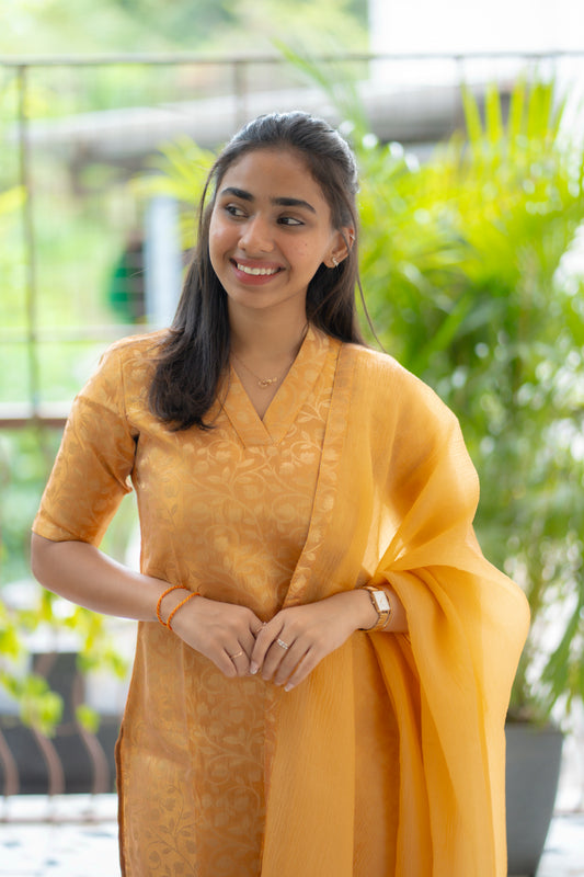A144 Pastel Orange Floral Brocade Kurti with Crush Silk Dupatta