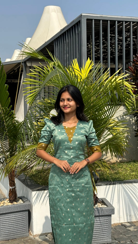 AA180 Teal Blue With Mustard Combo Shimmer Silk Kurti (warning :Don’t Iron)