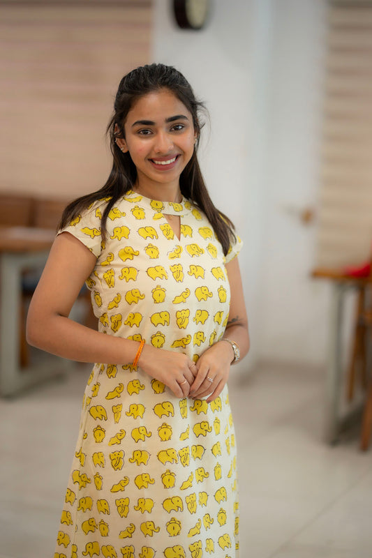 AA223 Beige Colour Yellow Elephant Print Cotton Aline Dress
