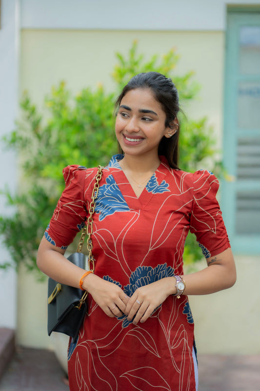 AA221 Cherry Red Butter Cotton Floral Kurti