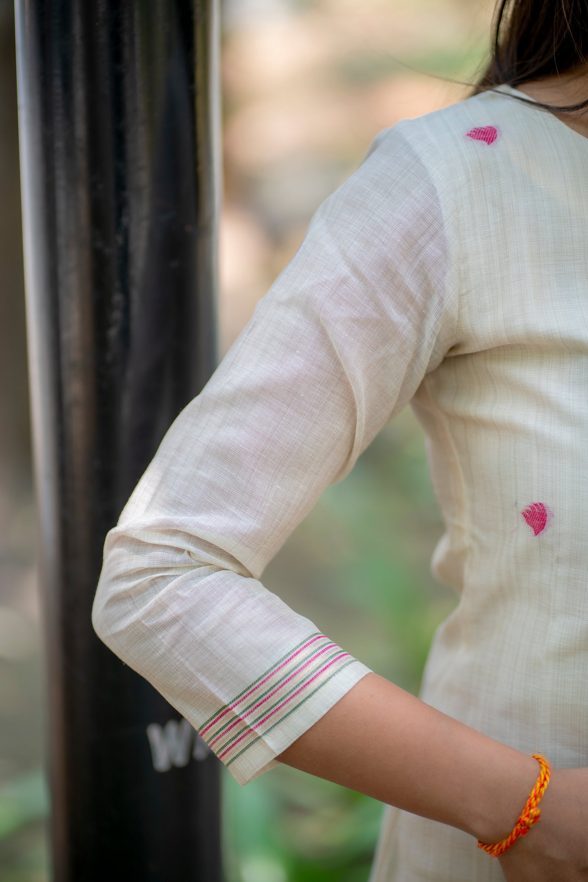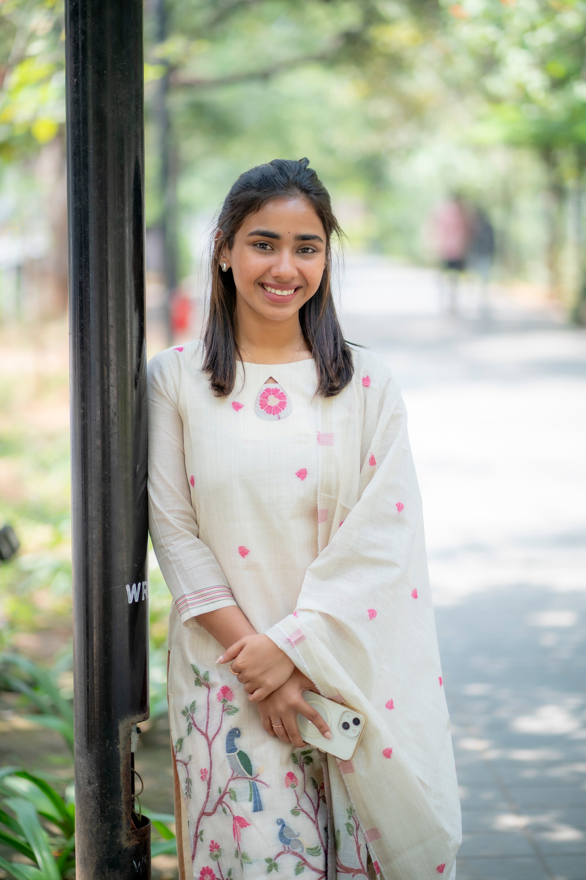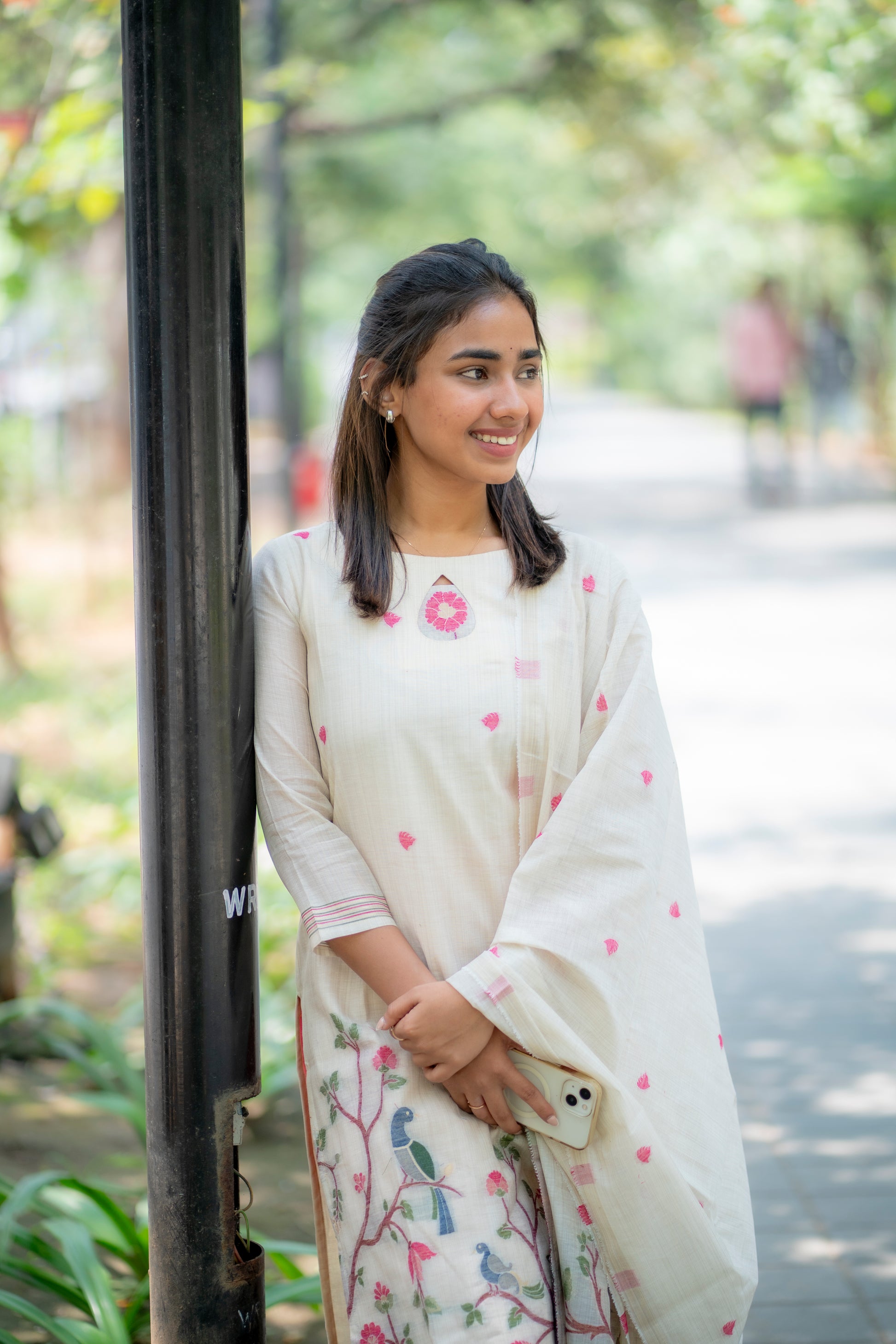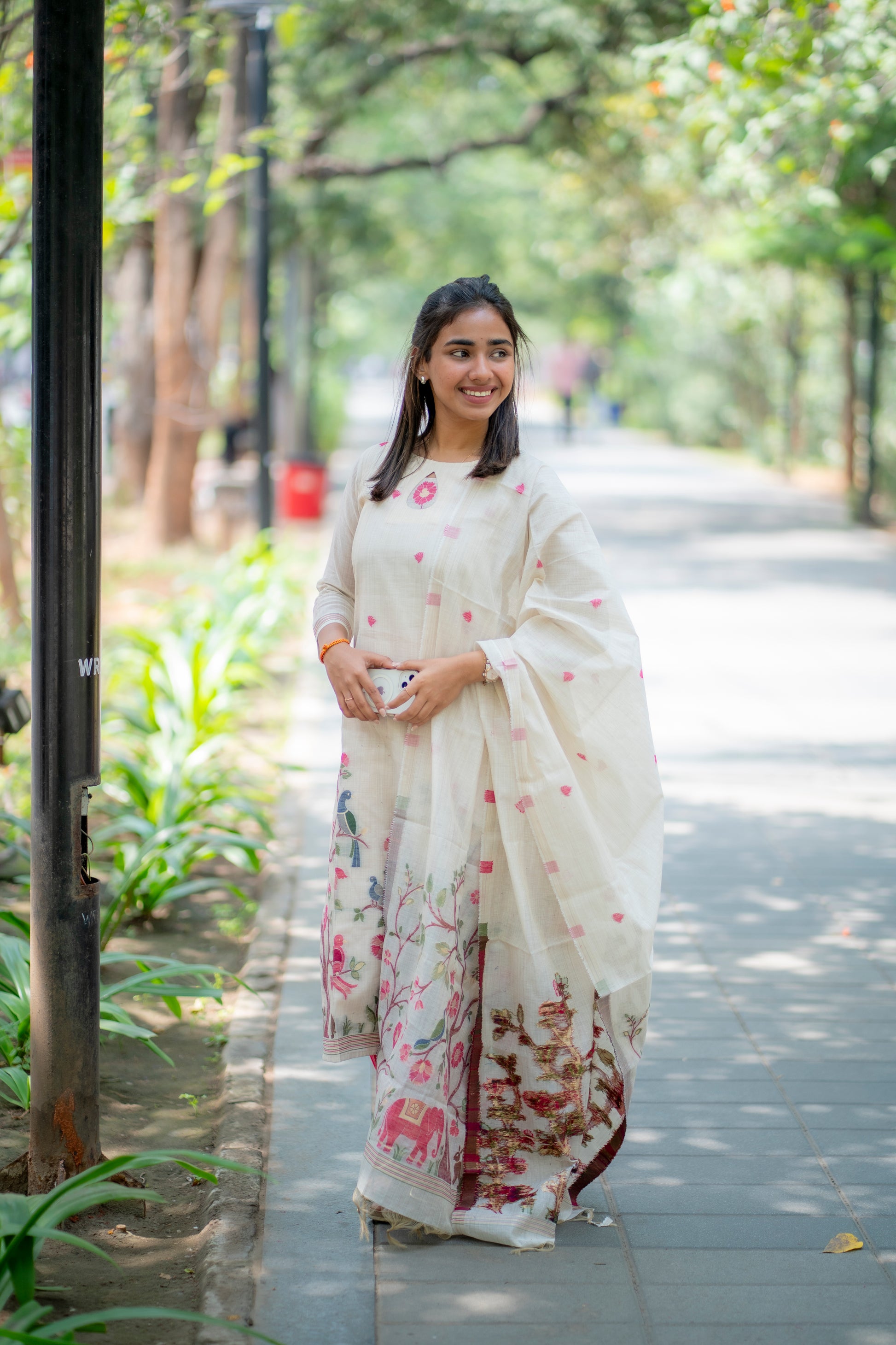 AA183 White Linen Jamdhani 3 Pc Set with beautiful Floral,Elephant,Peacock Prints