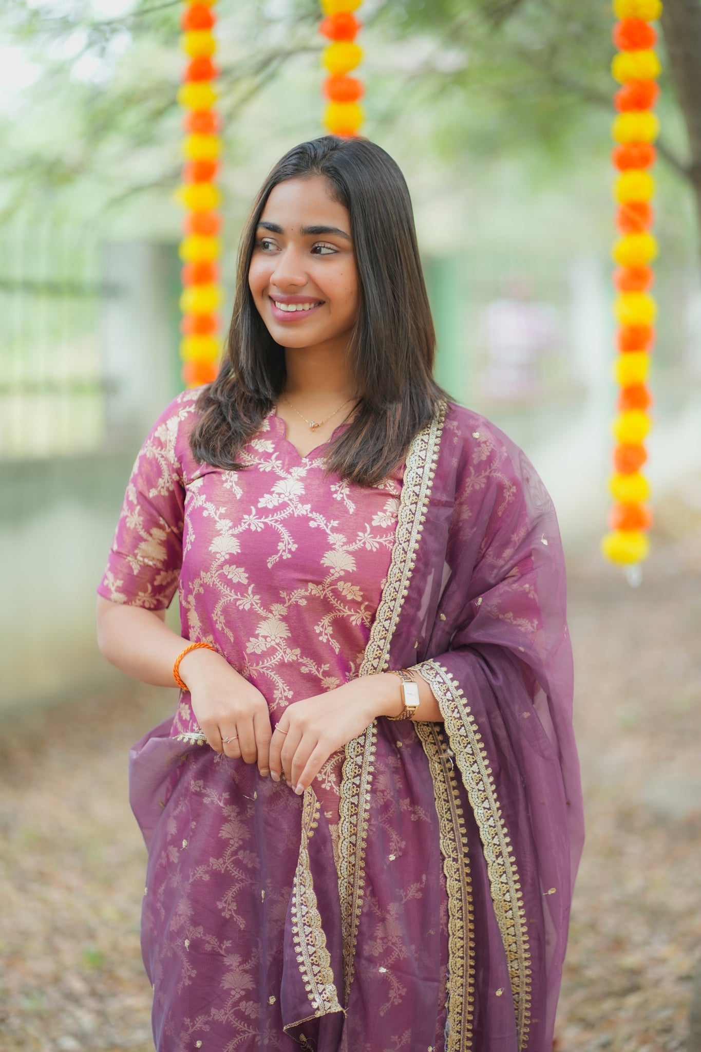 AA162 Wine with Golden Floral Zari Weaving Tissue Silk Kurti with Organza Sequence Dupatta