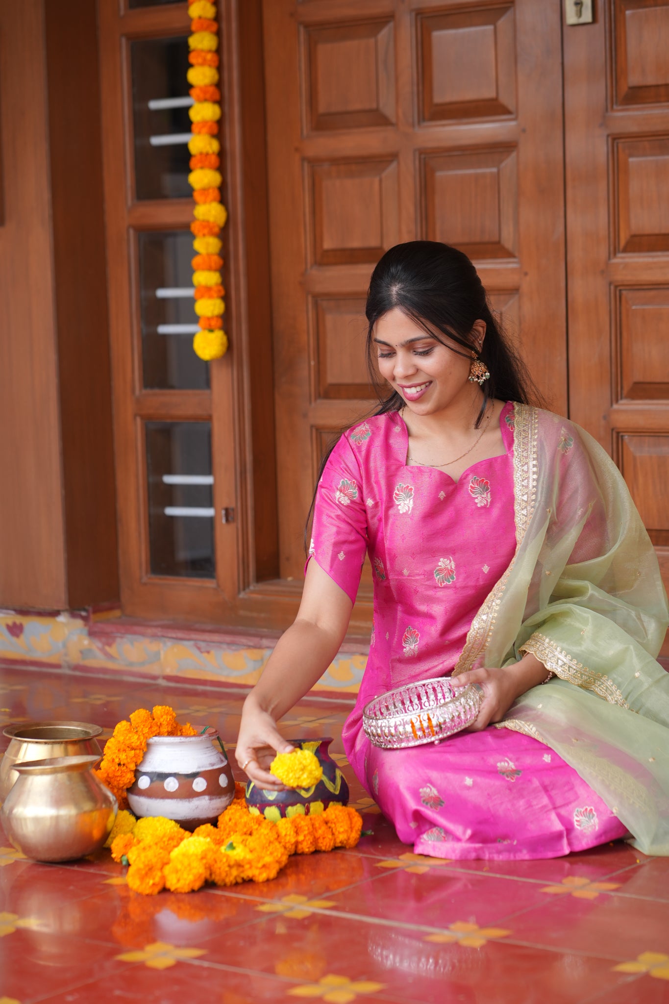 AA163 Pink Shimmer Silk A line Kurti with Pastel Green Organza Dupatta