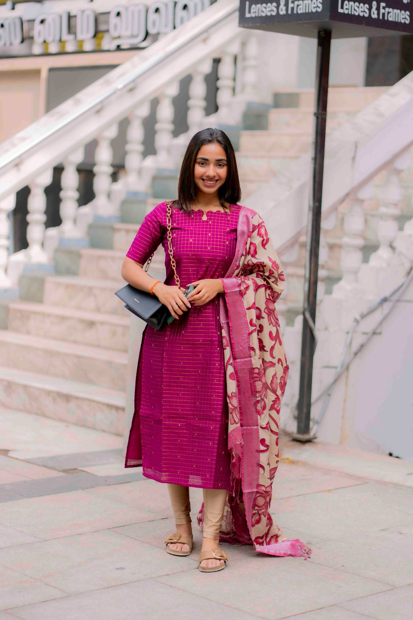 AA198 Dark Pink Raw Silk Kurti with Kalmkari Dupatta