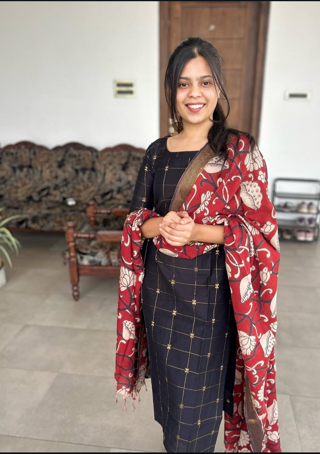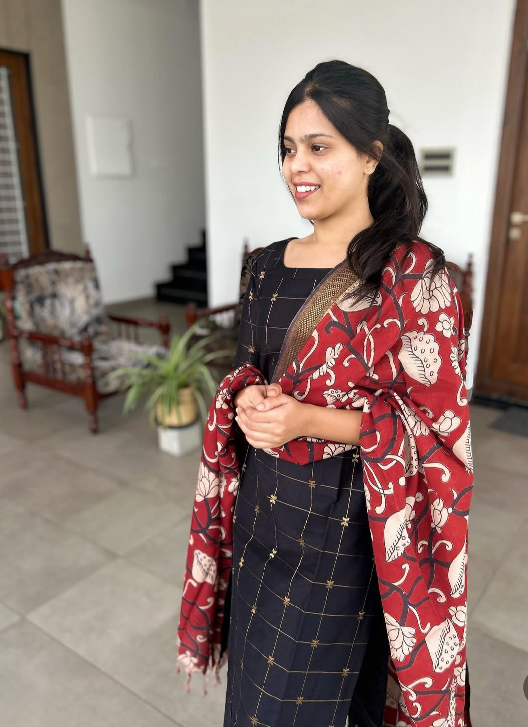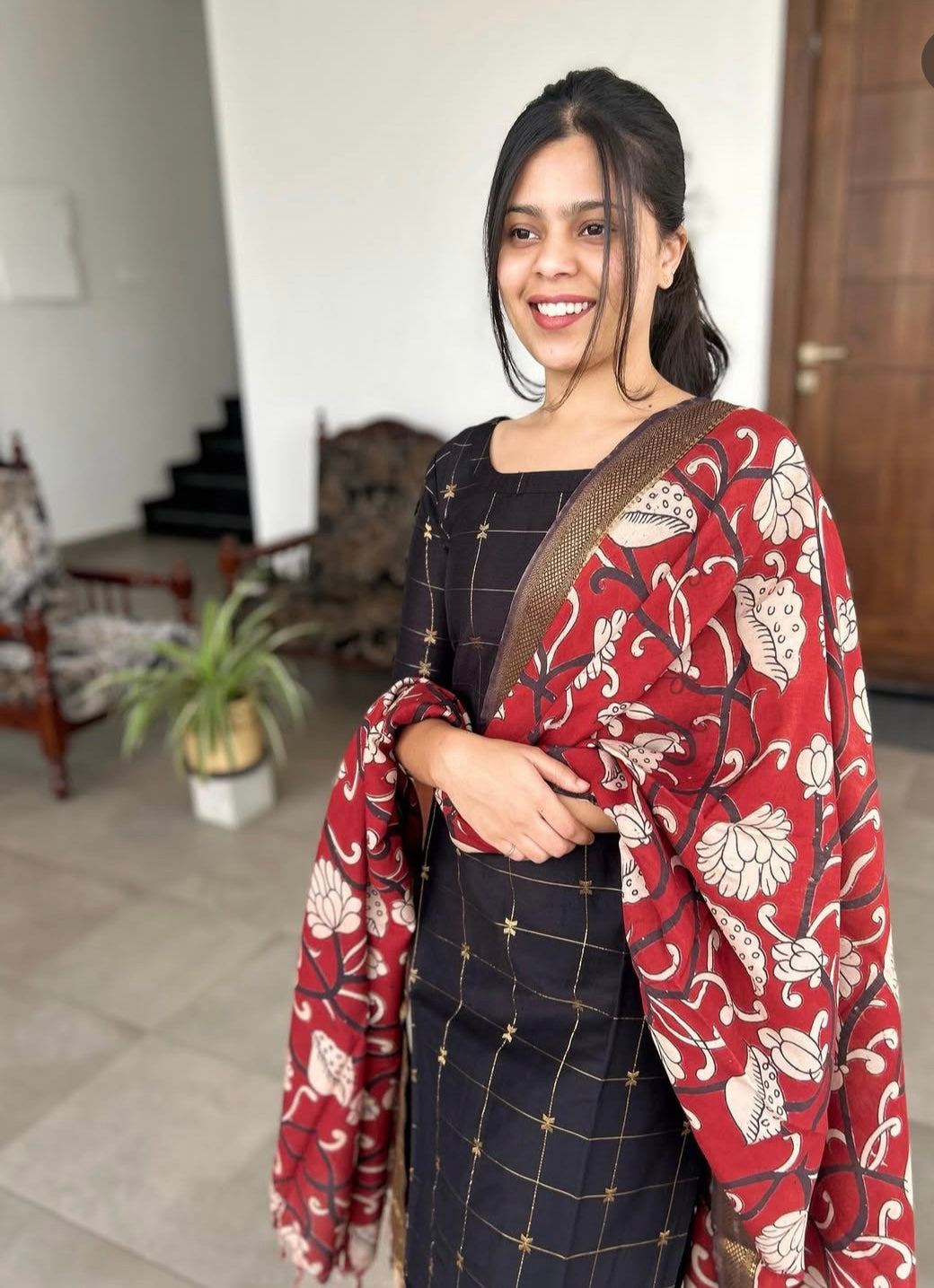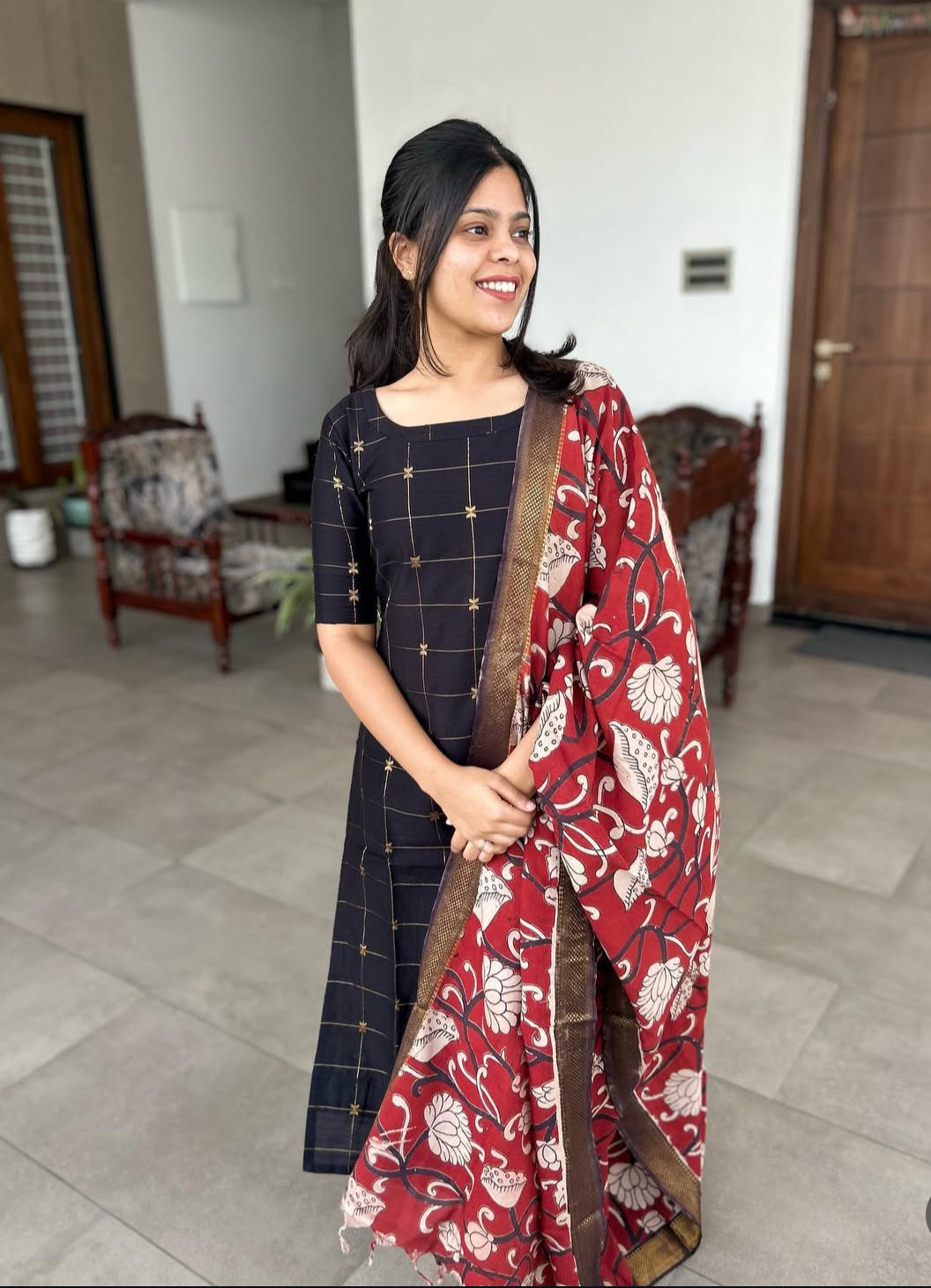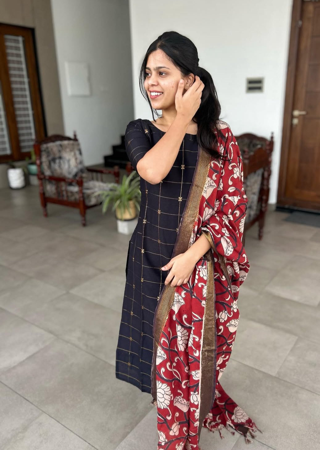 Black Raw Silk Kurti With Pure kalamkari Dupatta