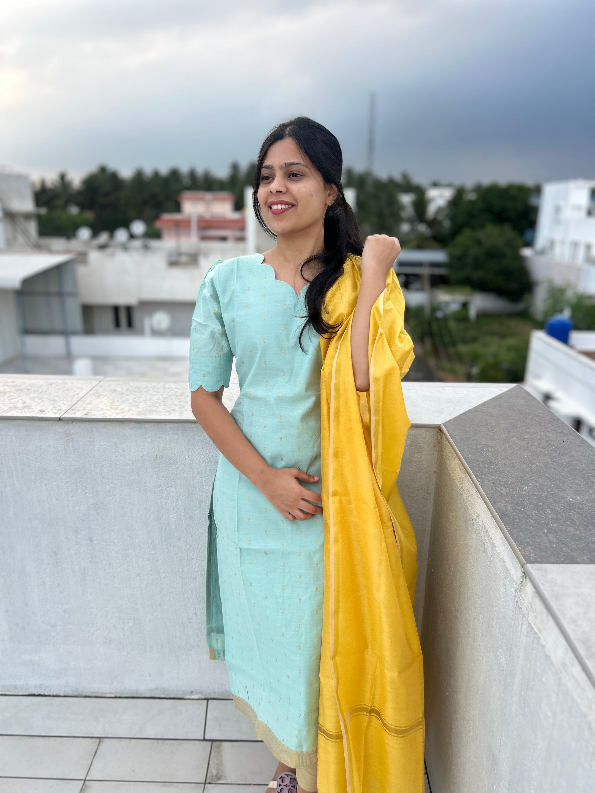 Sky Blue Silk Kurti with Yellow Chanderi Silk Dupatta