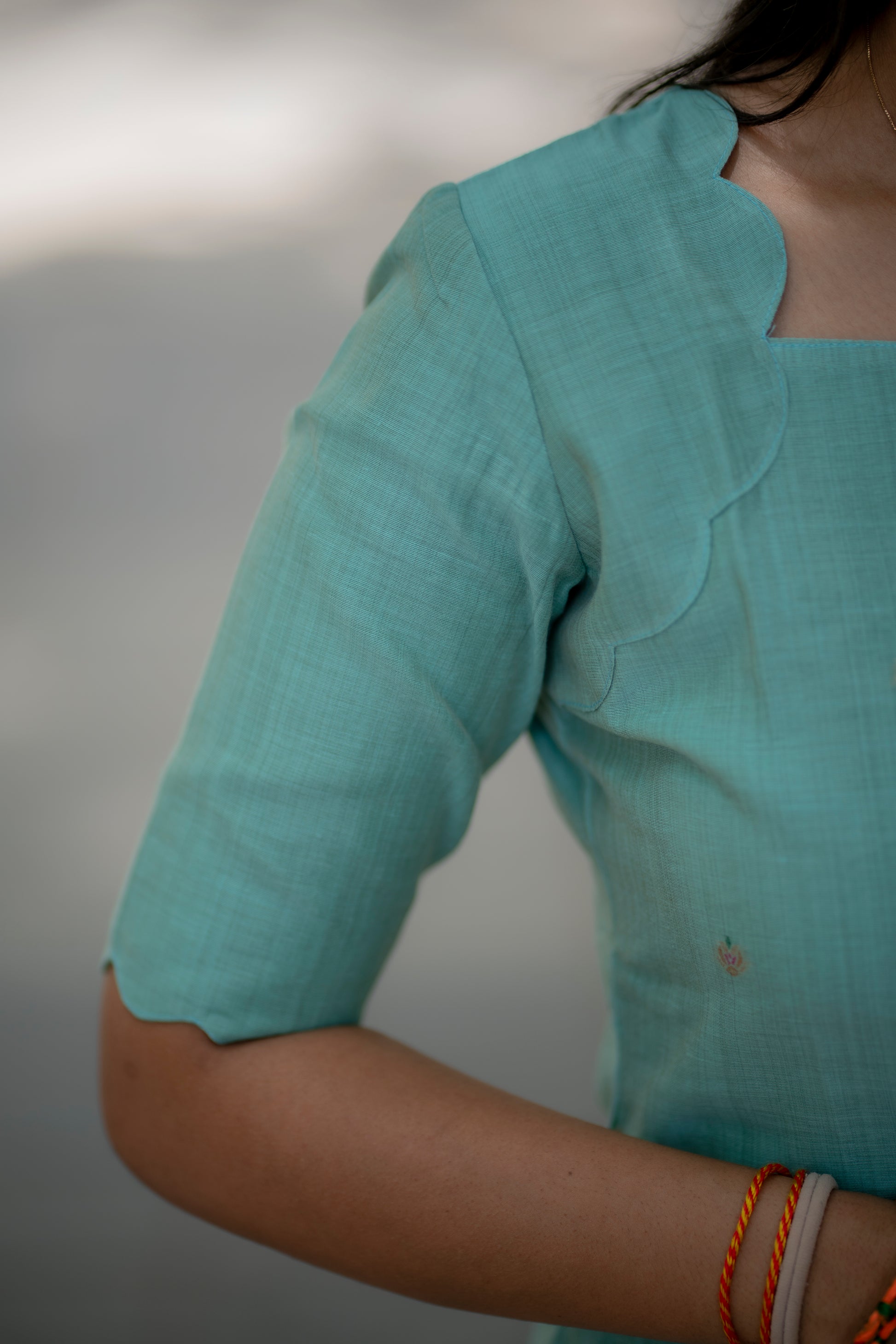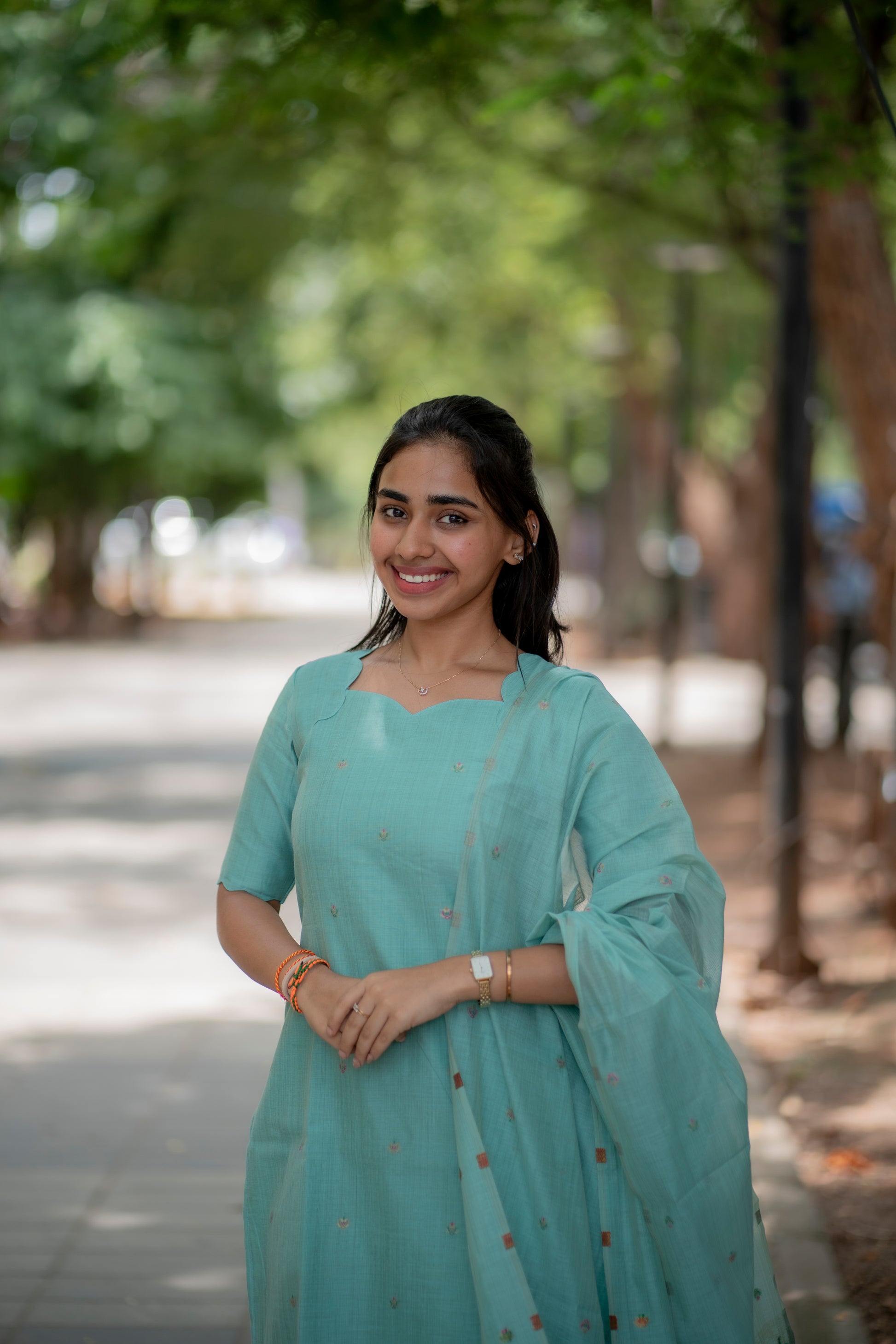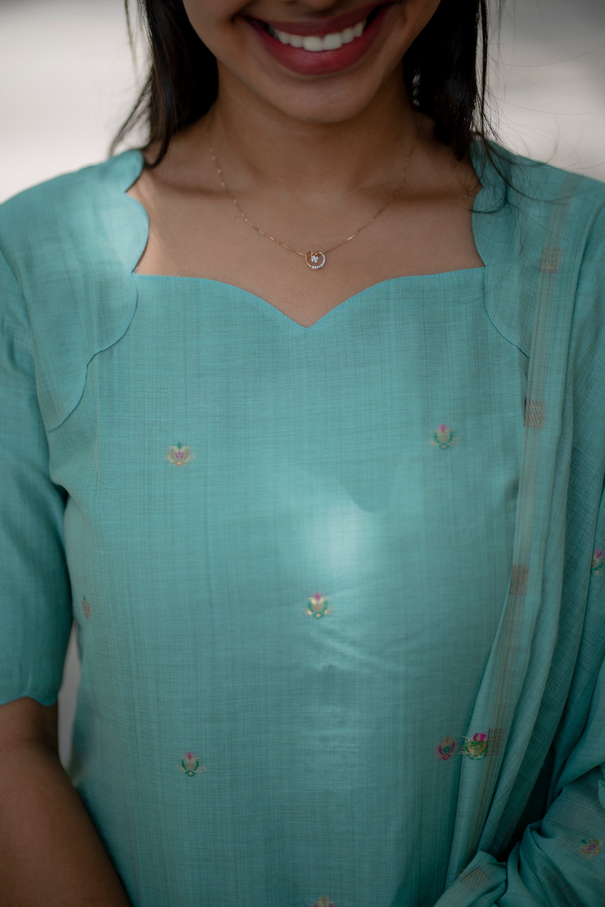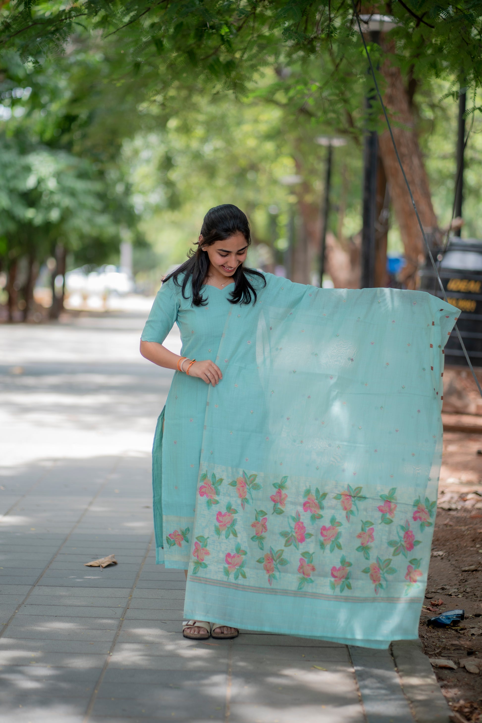 AA081 Blue Floral Jamdani Silk Kurti with Dupatta