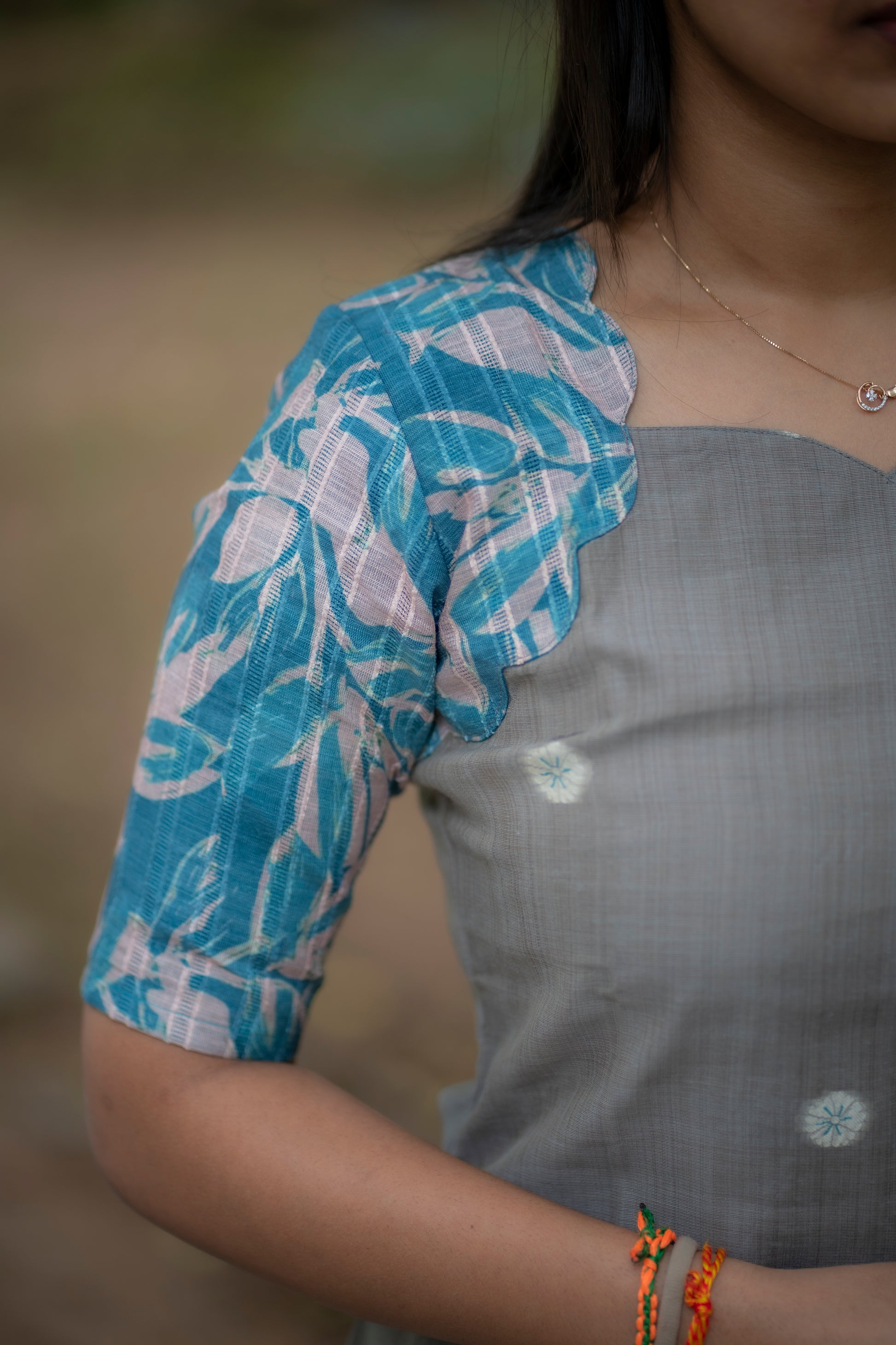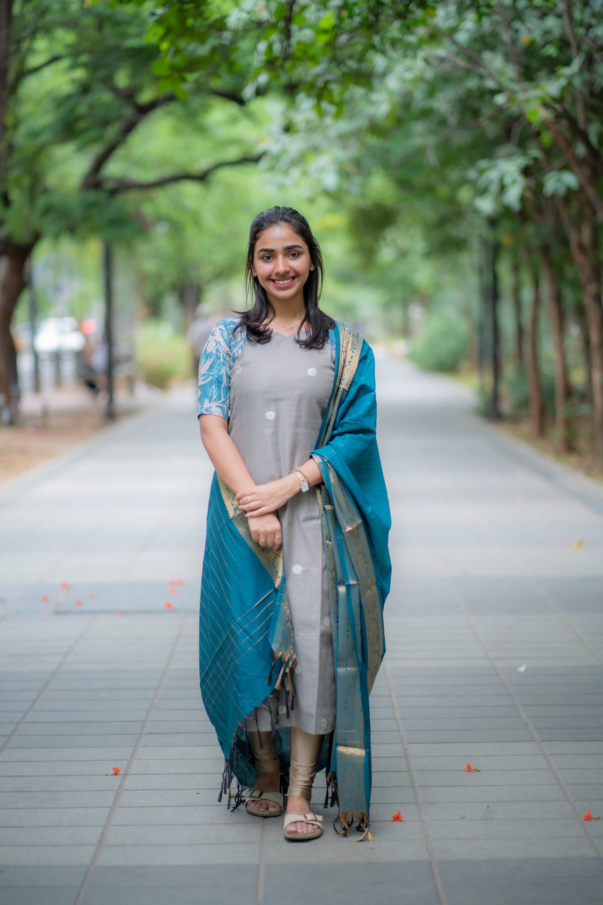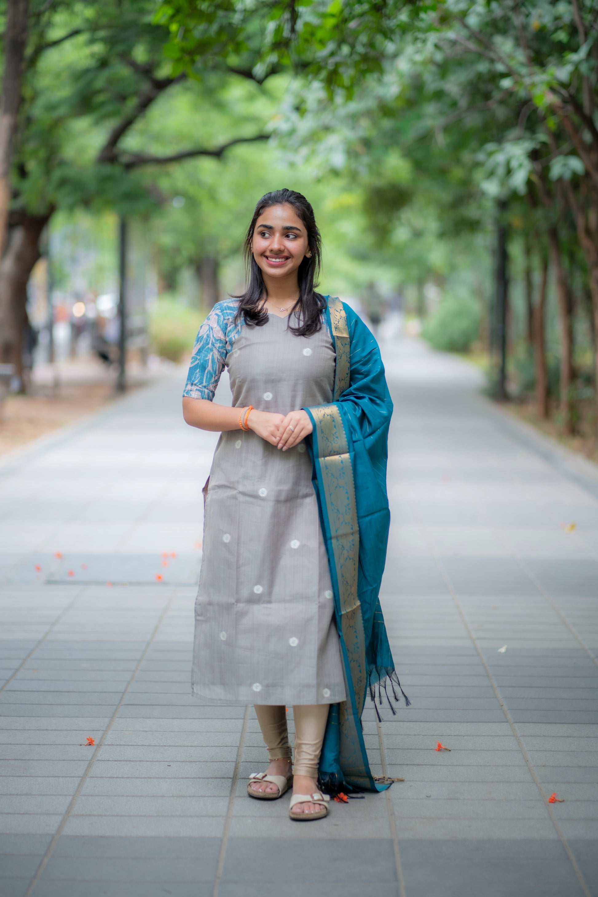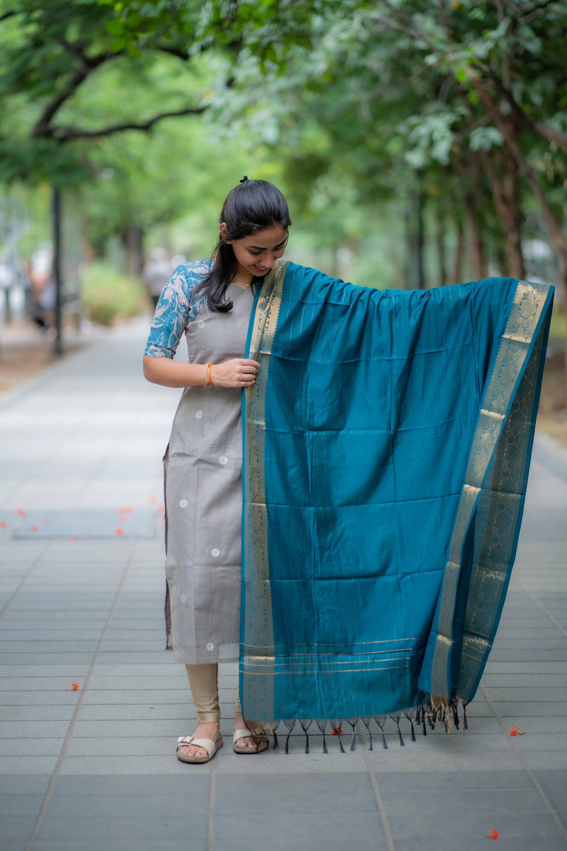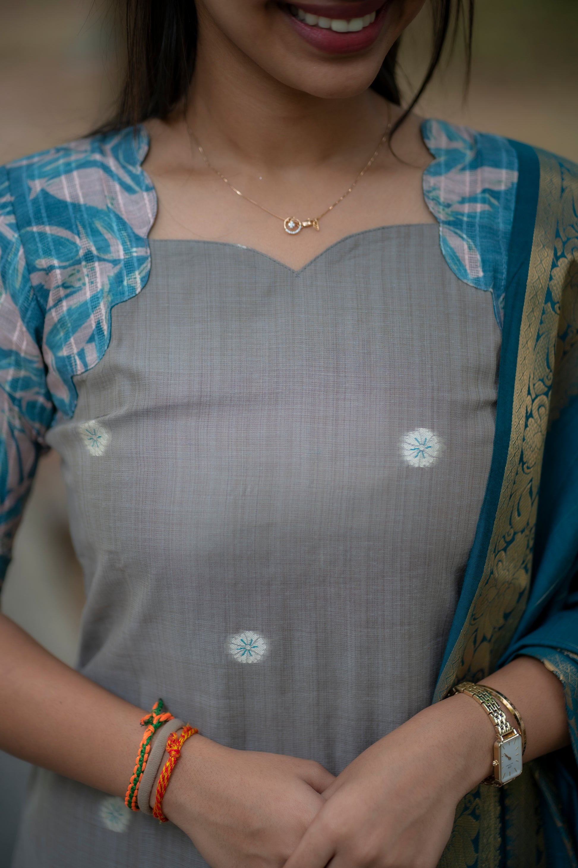 AA072 Grey Raw Silk Top with Peacock Blue Dupatta