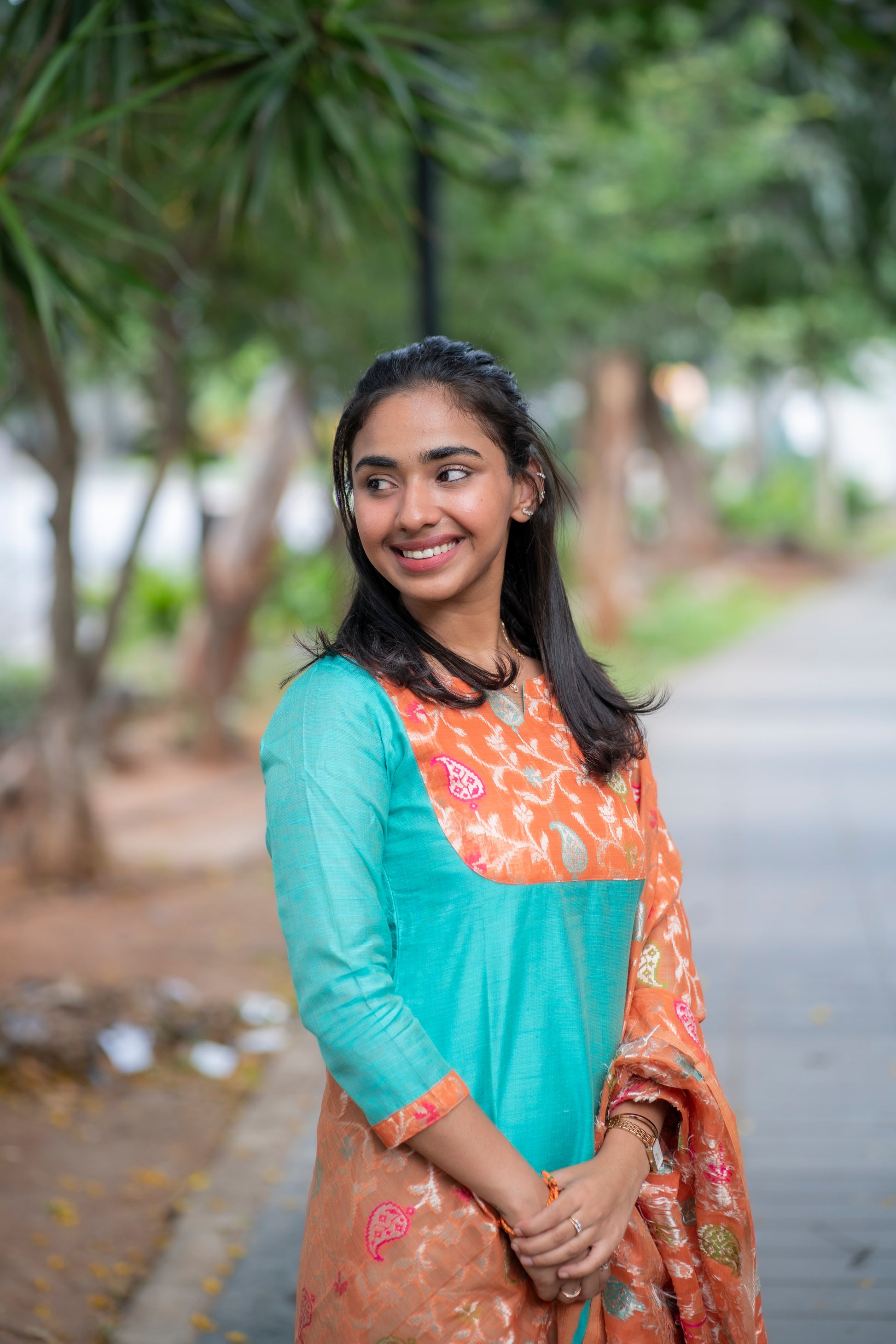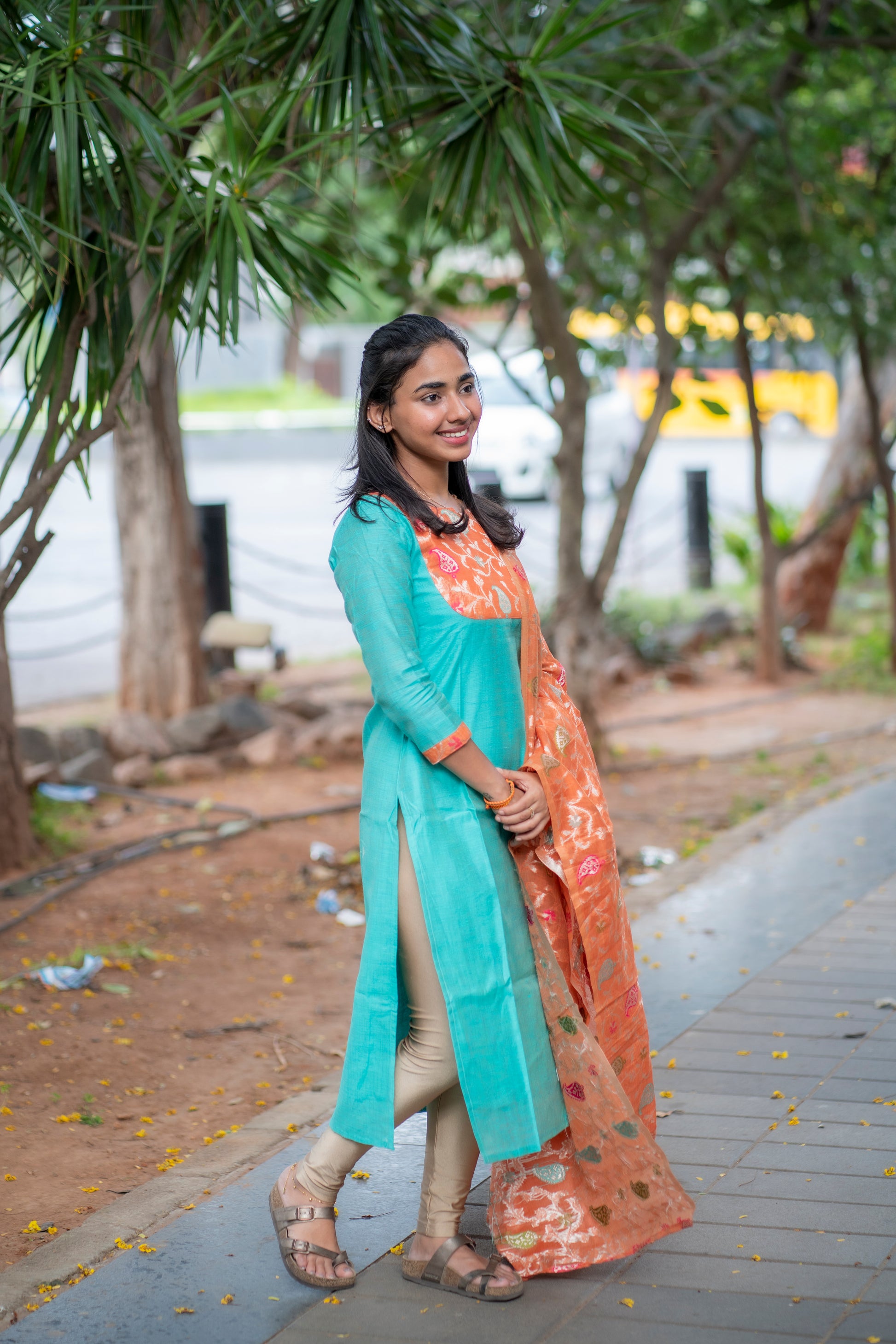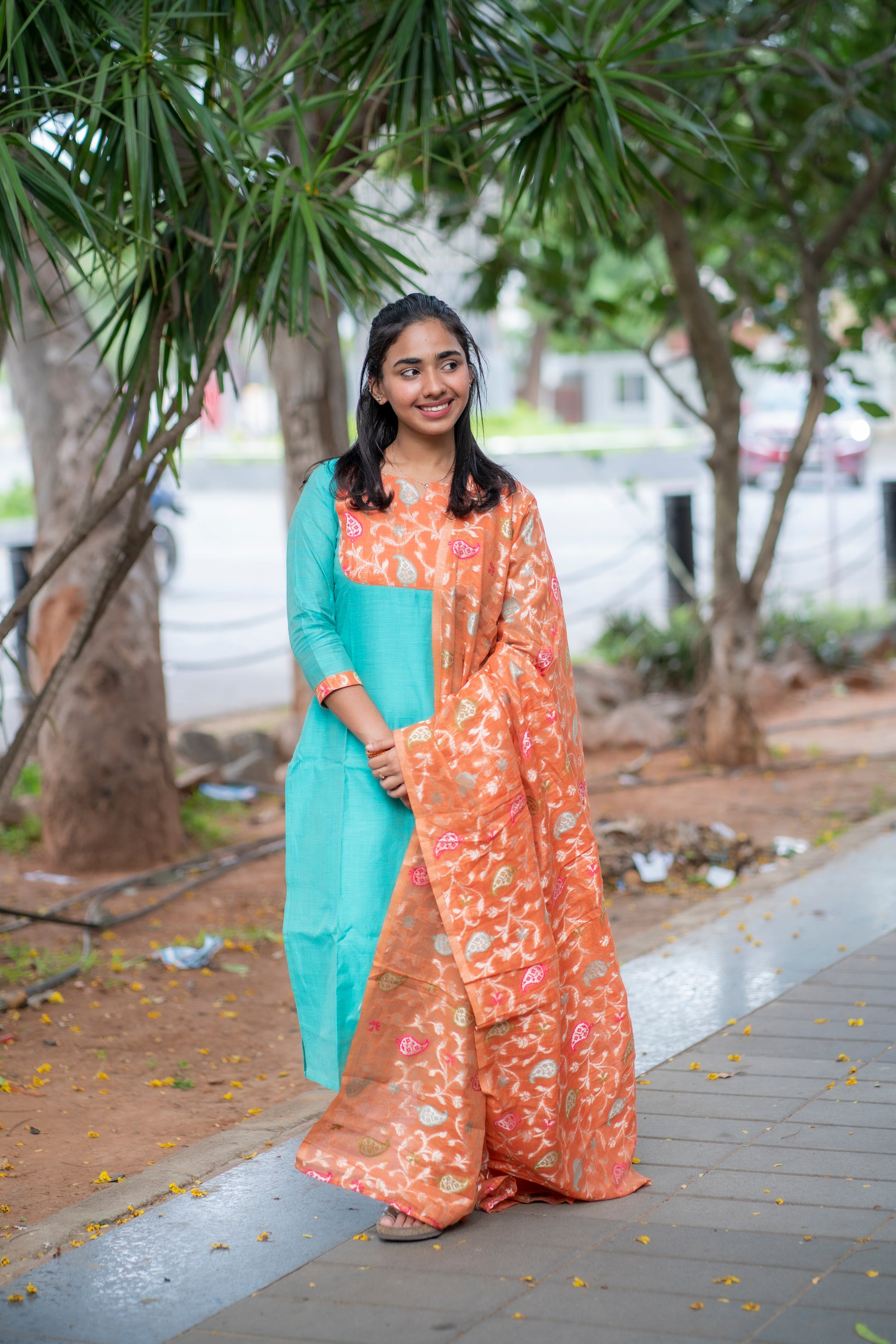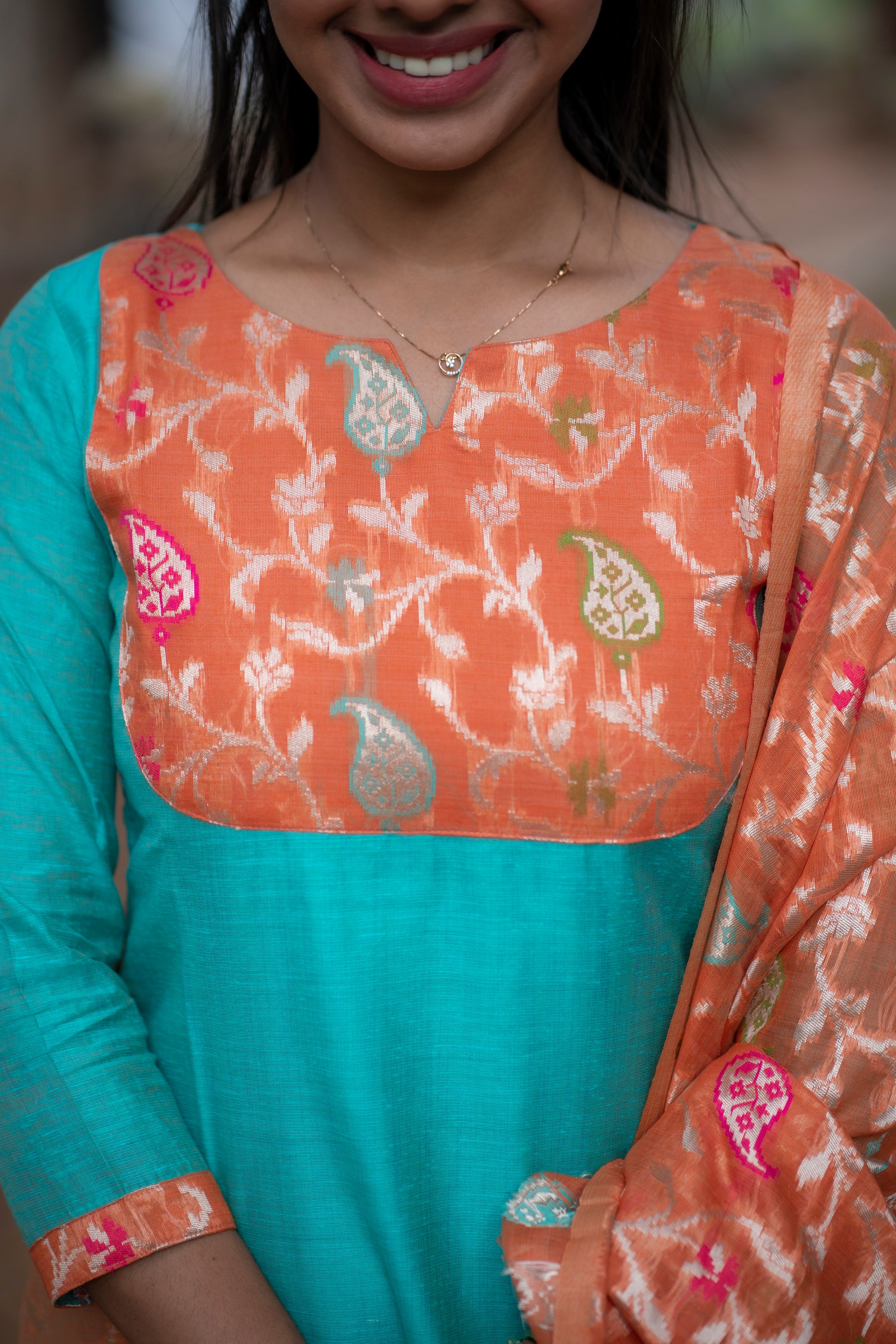 AA097 Blue Raw silk Kurti with Orange Jacquard Dupatta