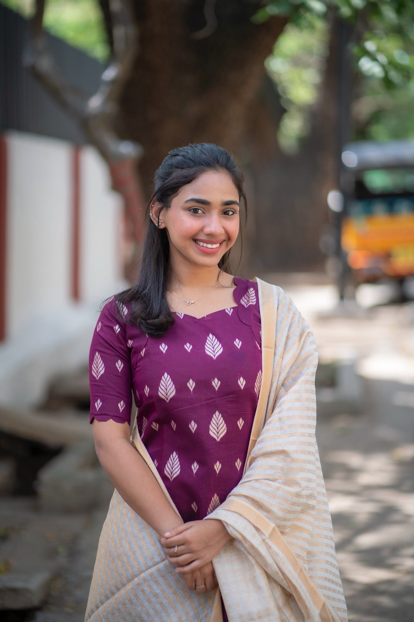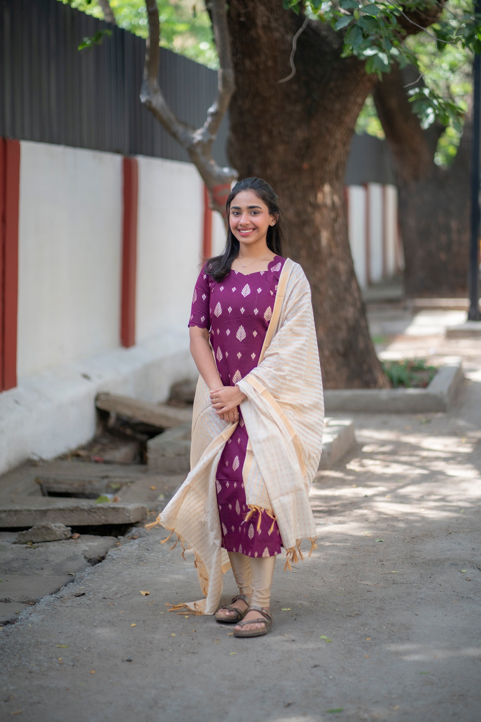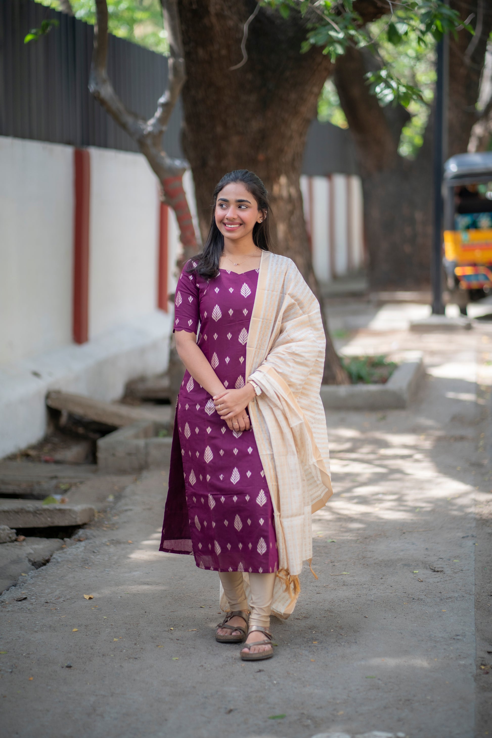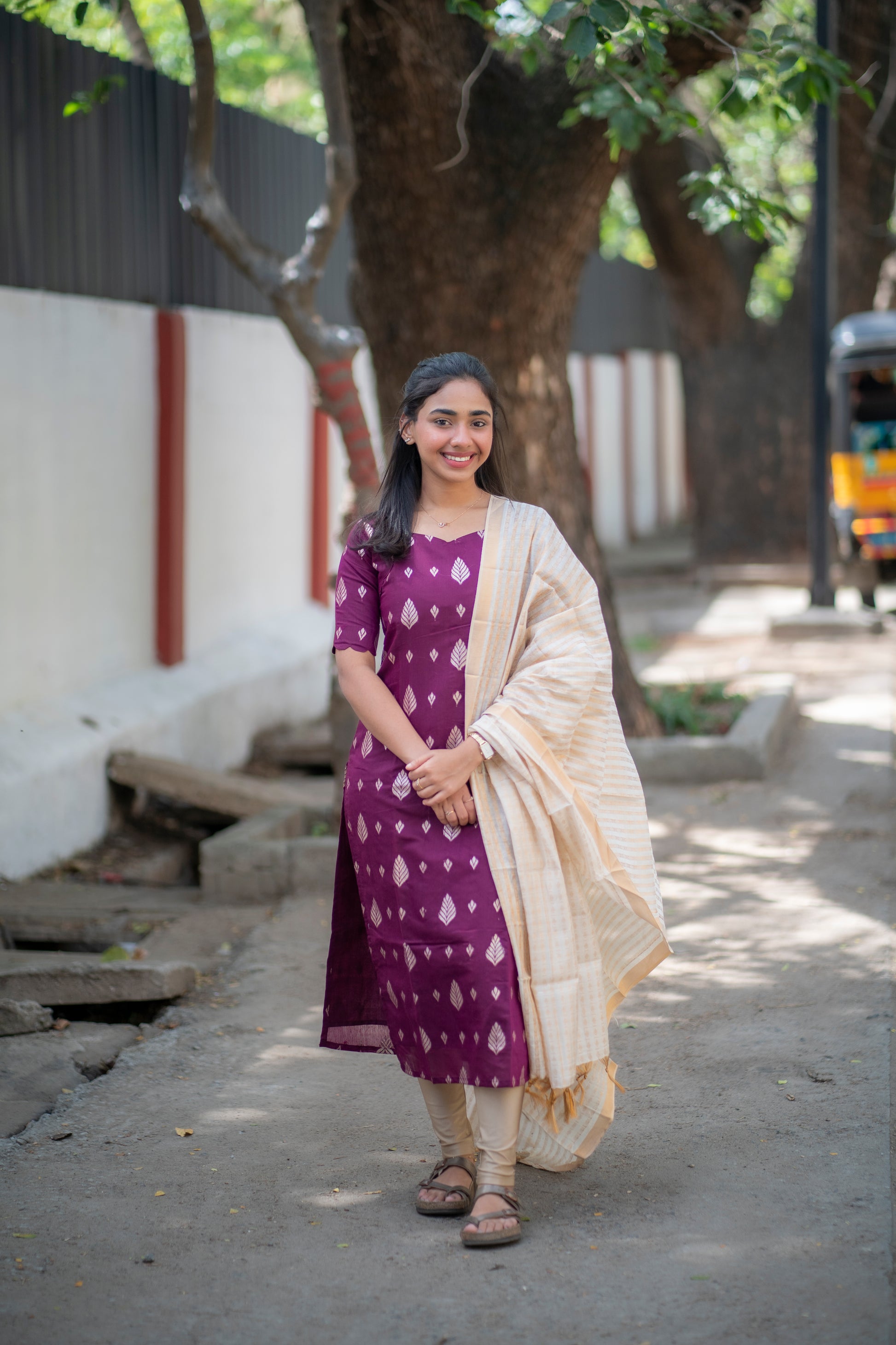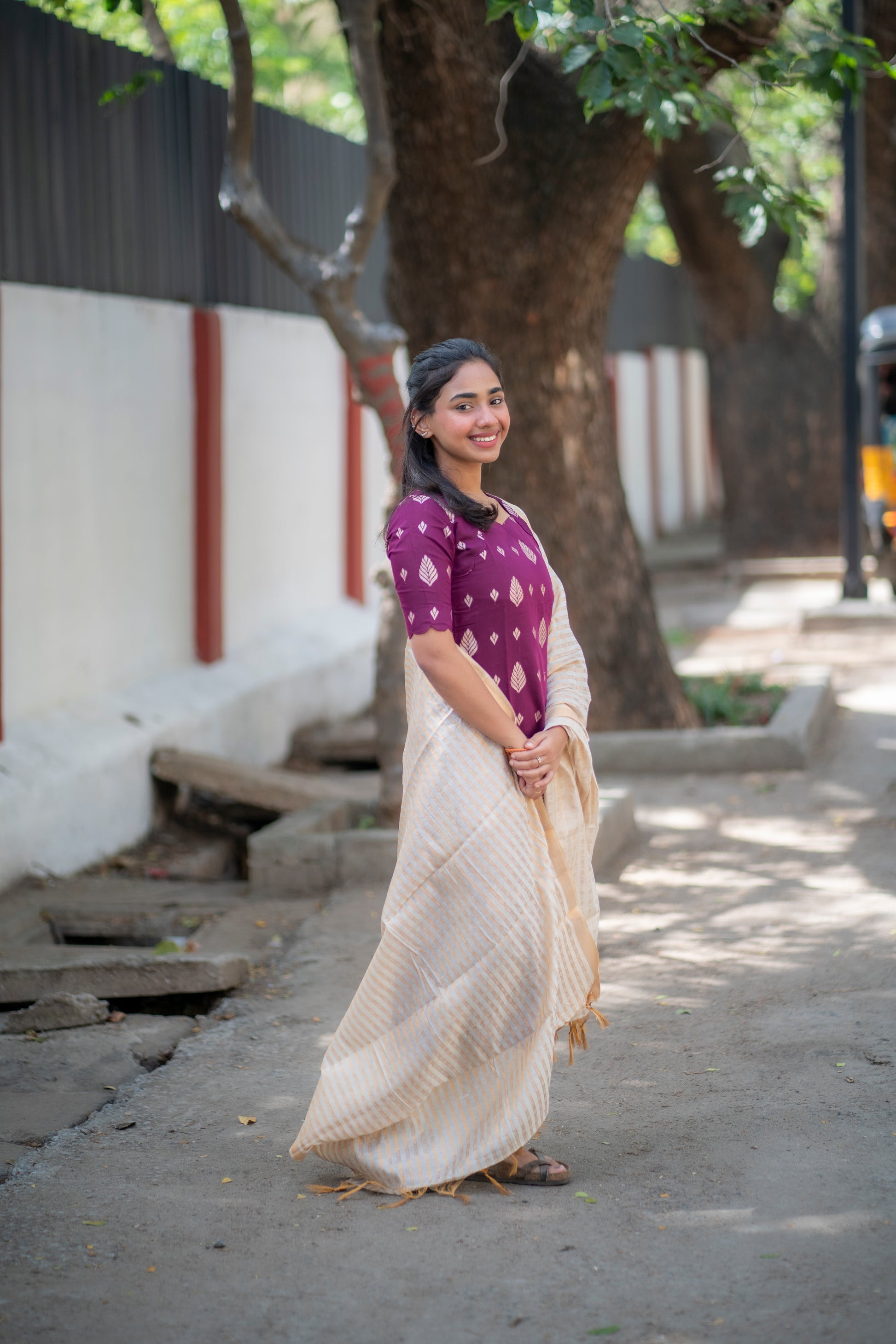 AA100 Wine Jacquard Silk Kurti with White Golden stripes